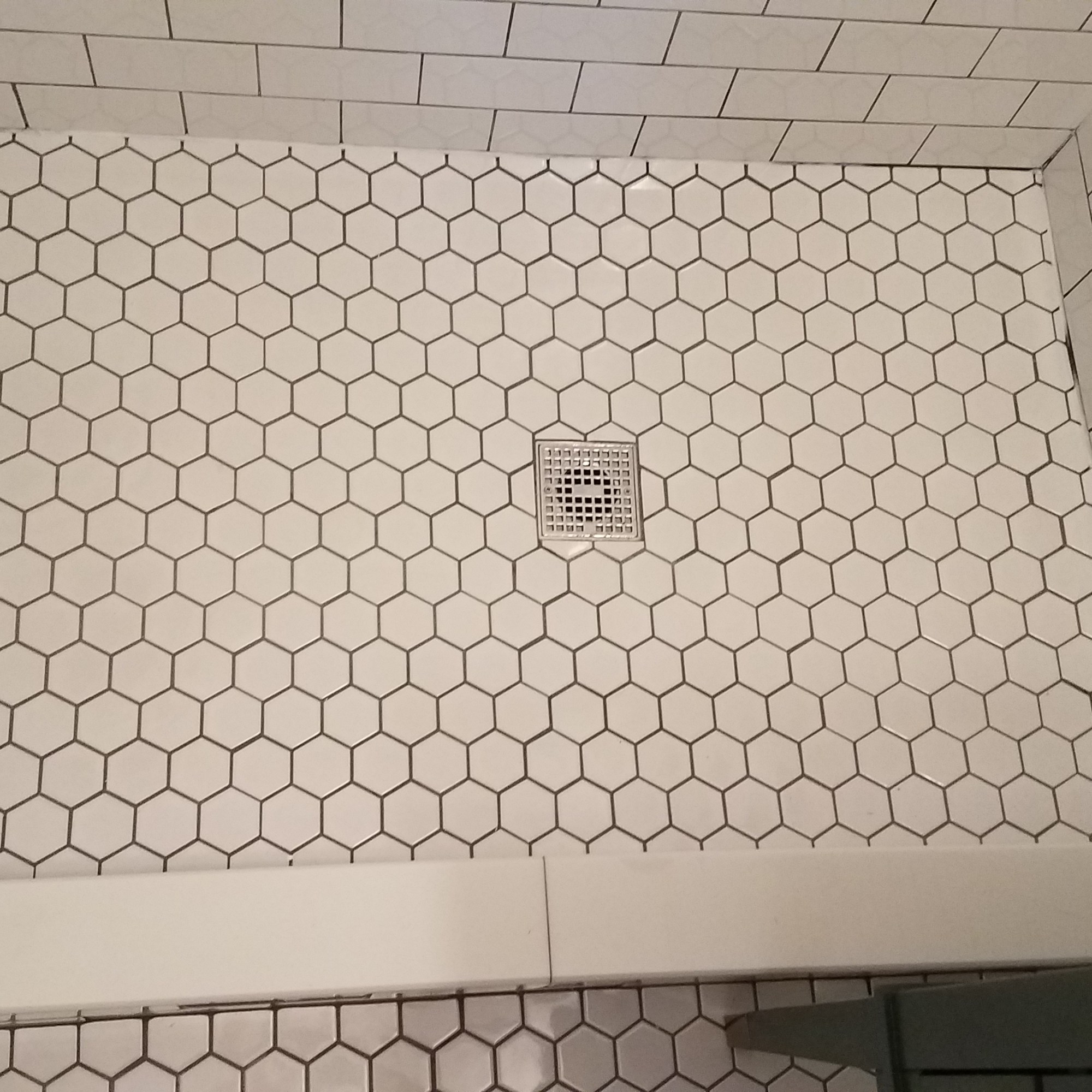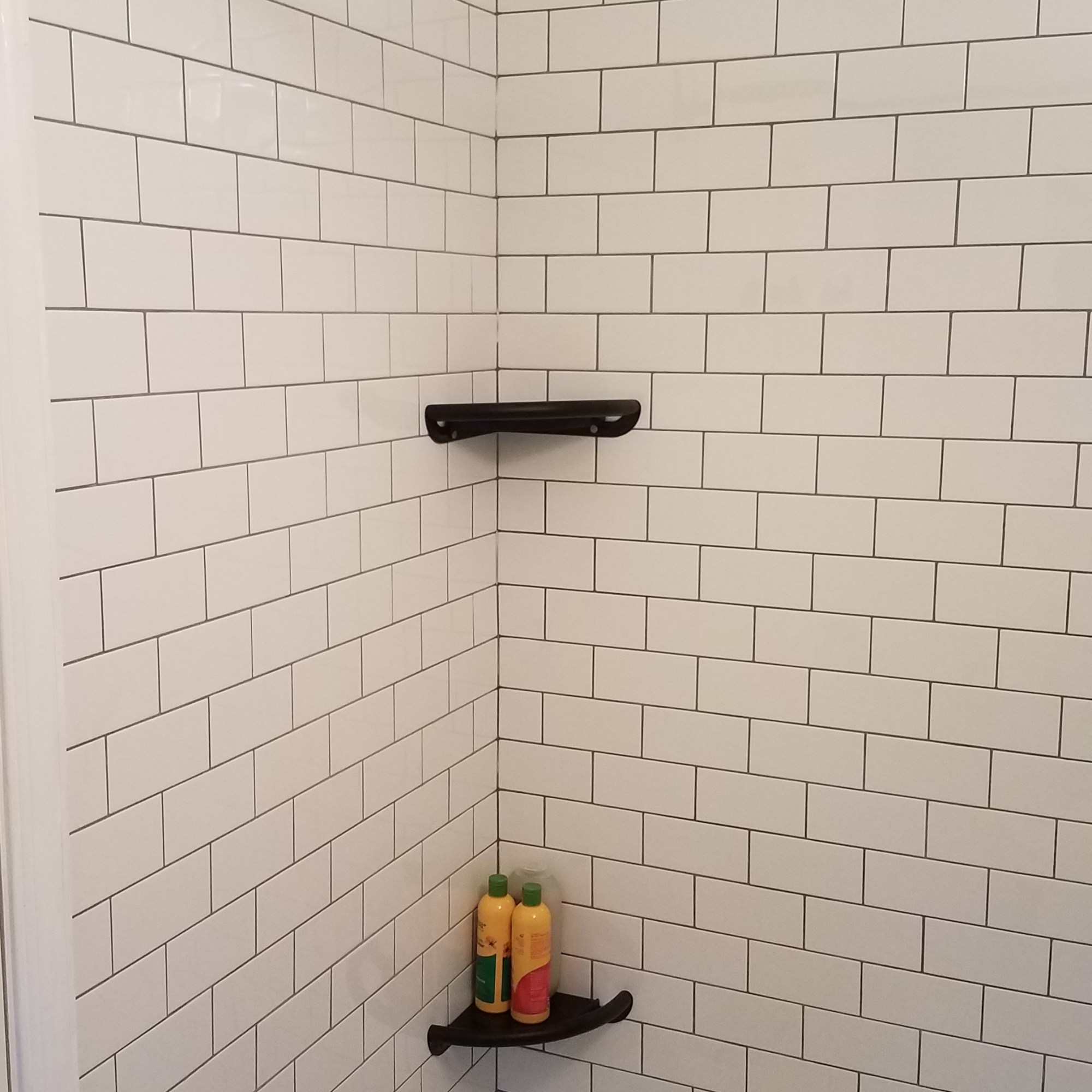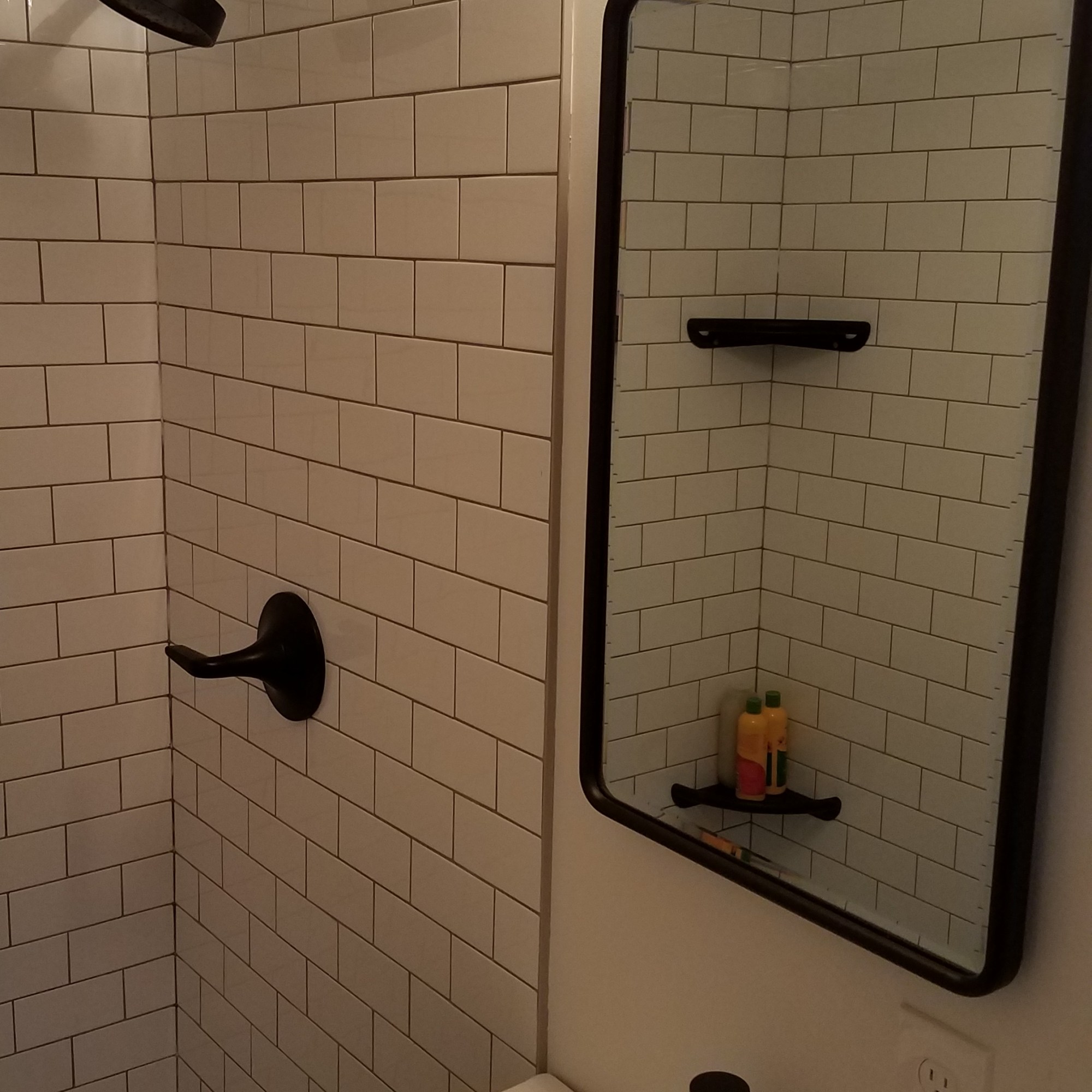Bathroom remodel with new vanity, fixtures, and mirror and custom shower with subway wall tiles and hexagonal floor tiles, shelves, and new fixtures. October 2021