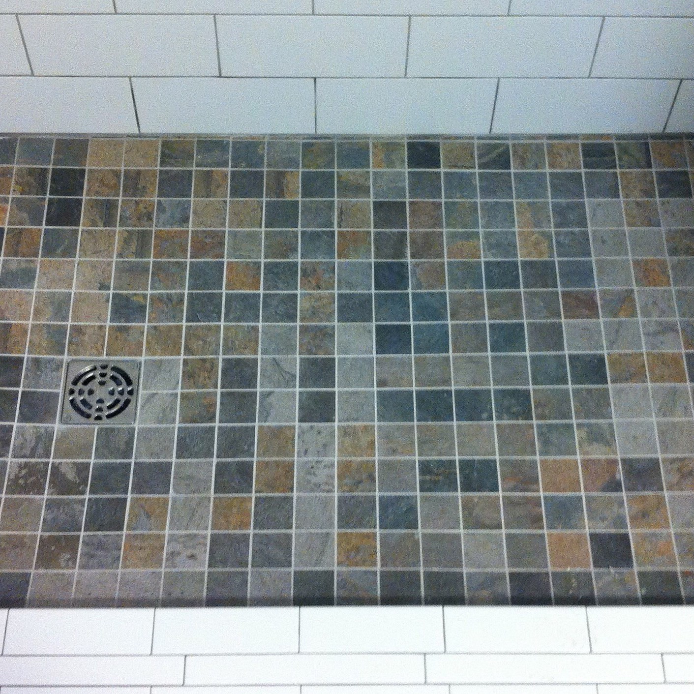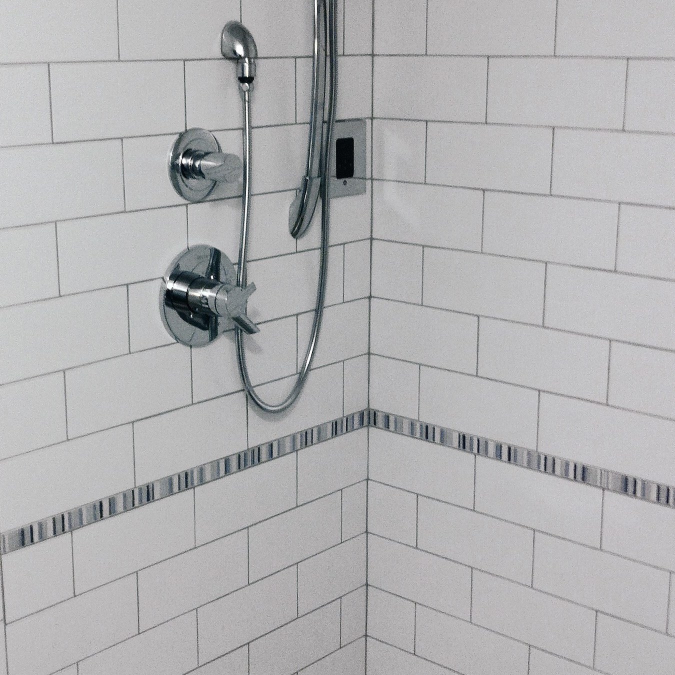 Shower remodel with subway wall tiles, square floor tiles, and new multi-function shower head. August 2020
