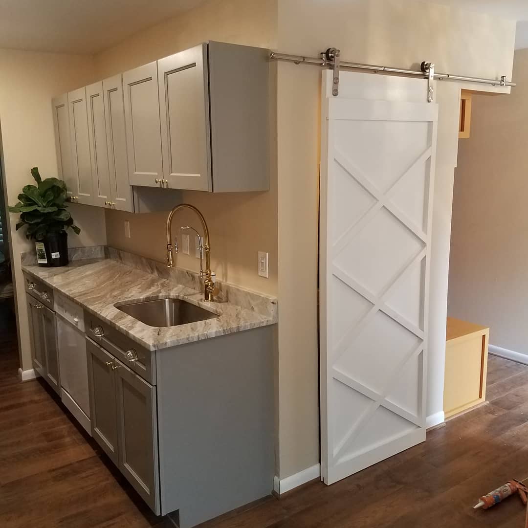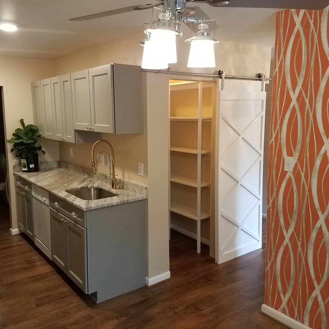 Kitchen remodel with granite countertops, pull-down faucet, custom sliding barn door, walk-in pantry with custom wood shelving, and mudroom built-in with storage and coat hooks. June 2020
