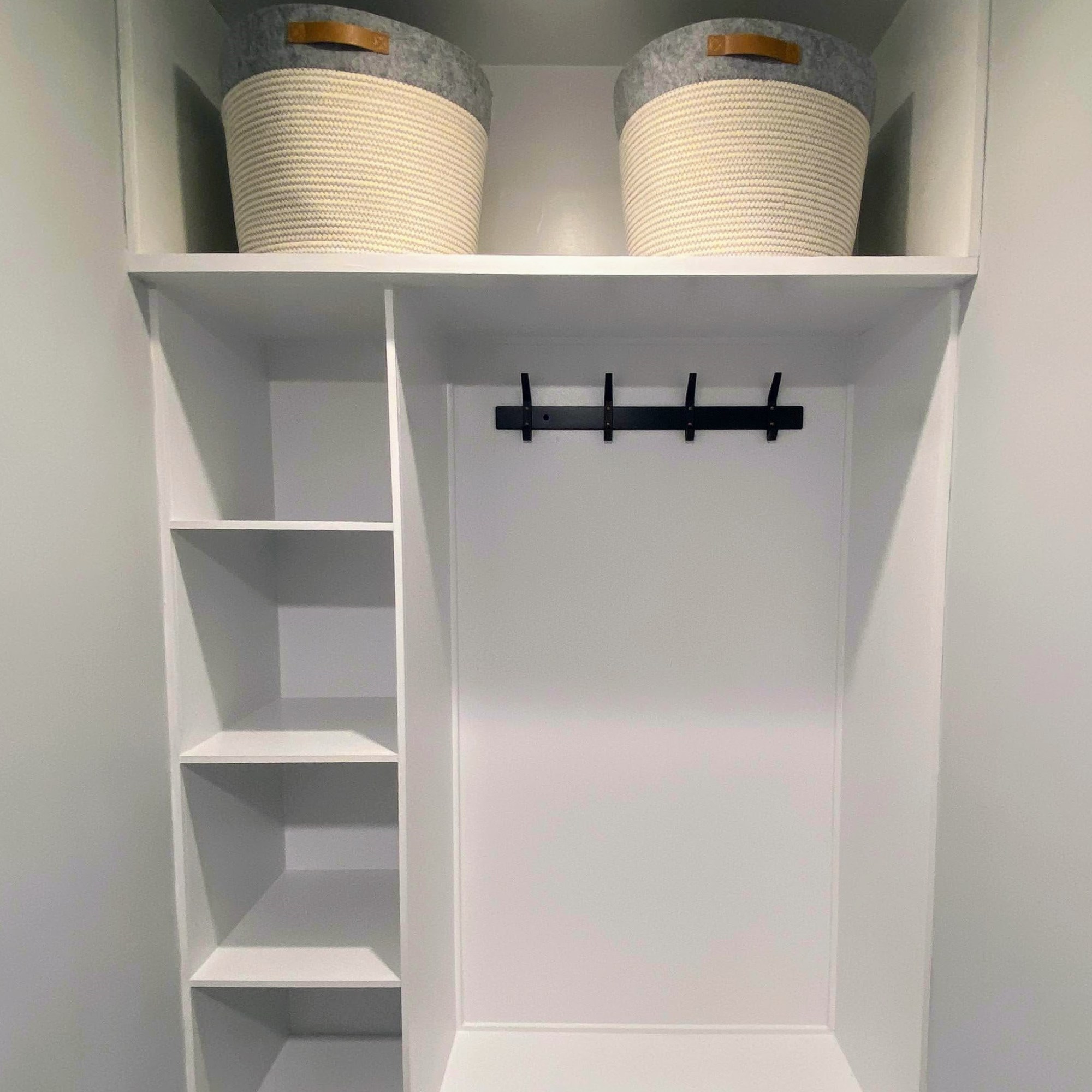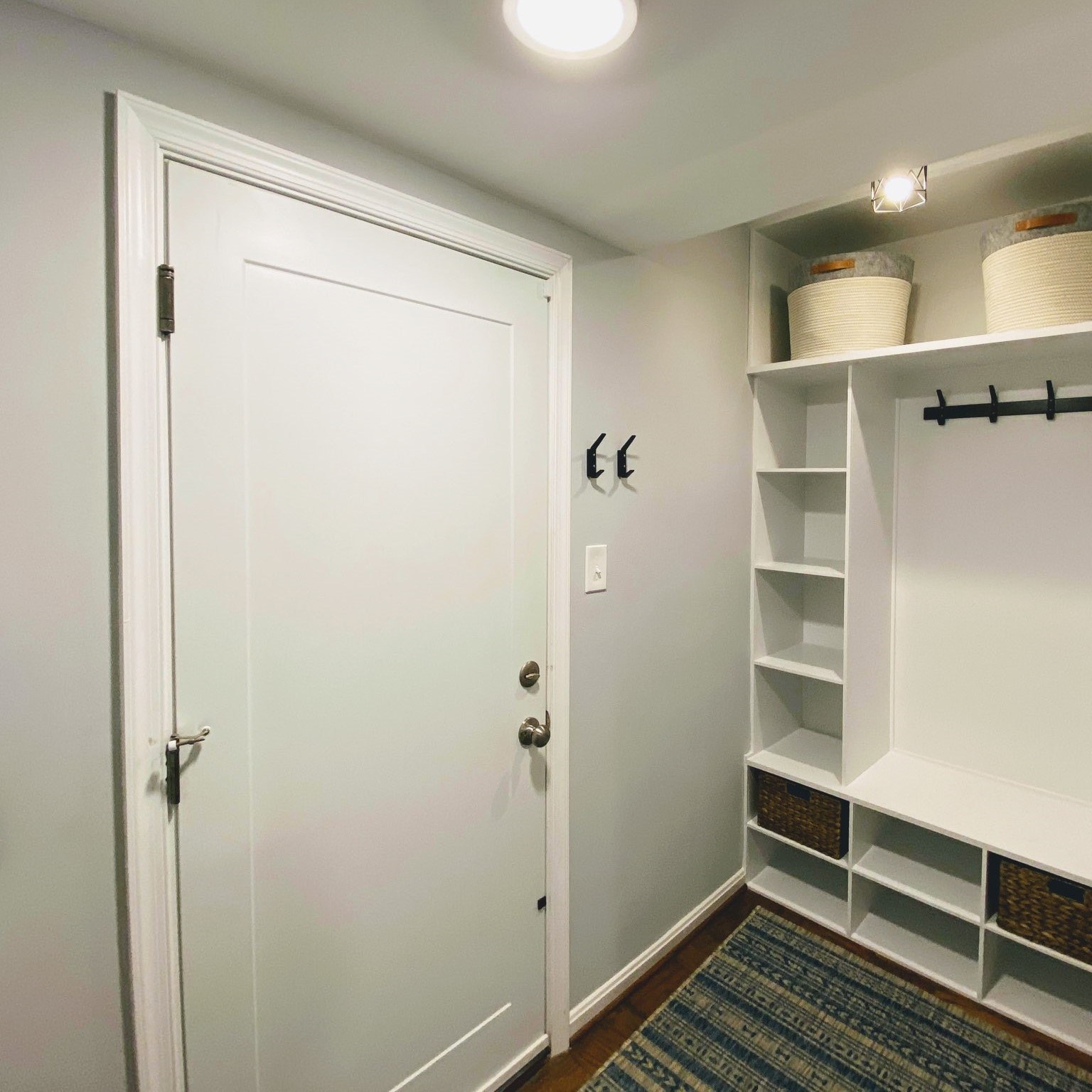Mudroom Built-in Custom mudroom built-in with storage and coat hooks. October 2020 Tagged Built-ins, Mudroom, Painting